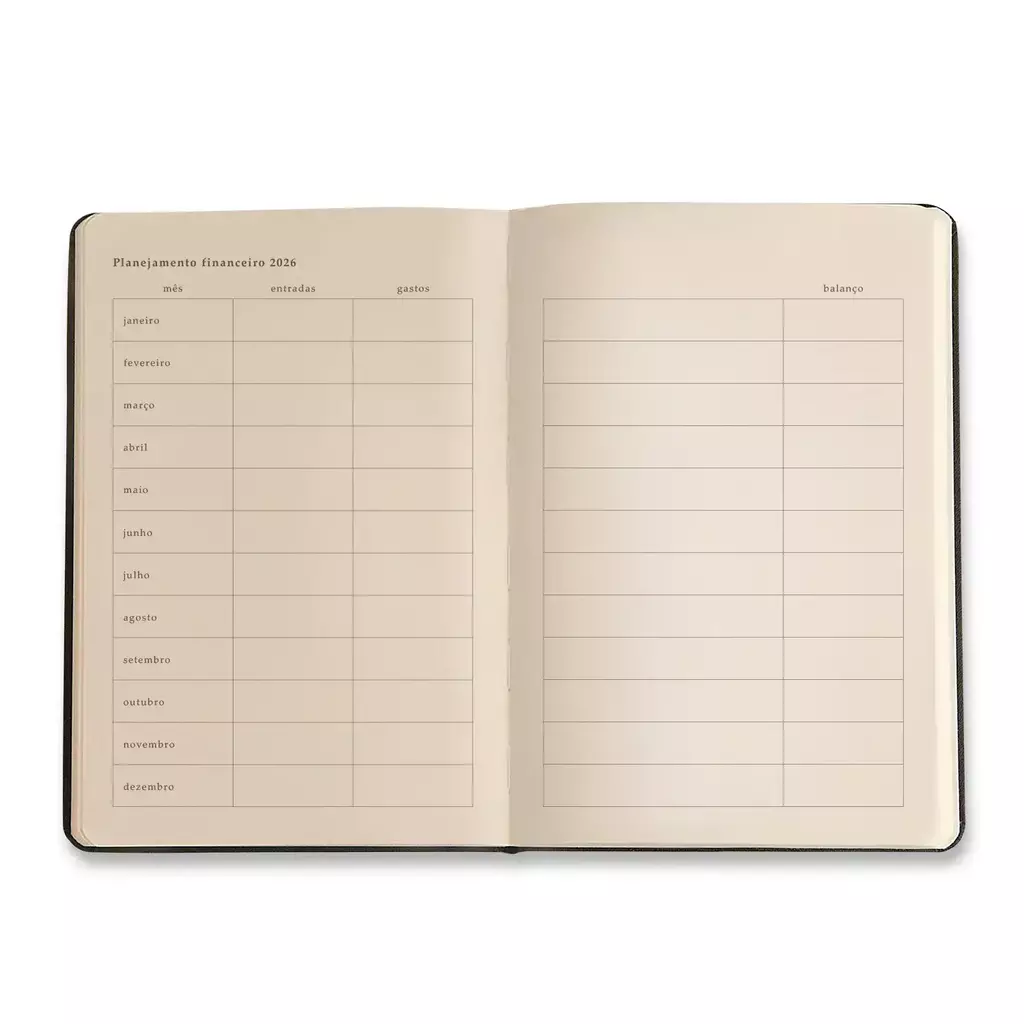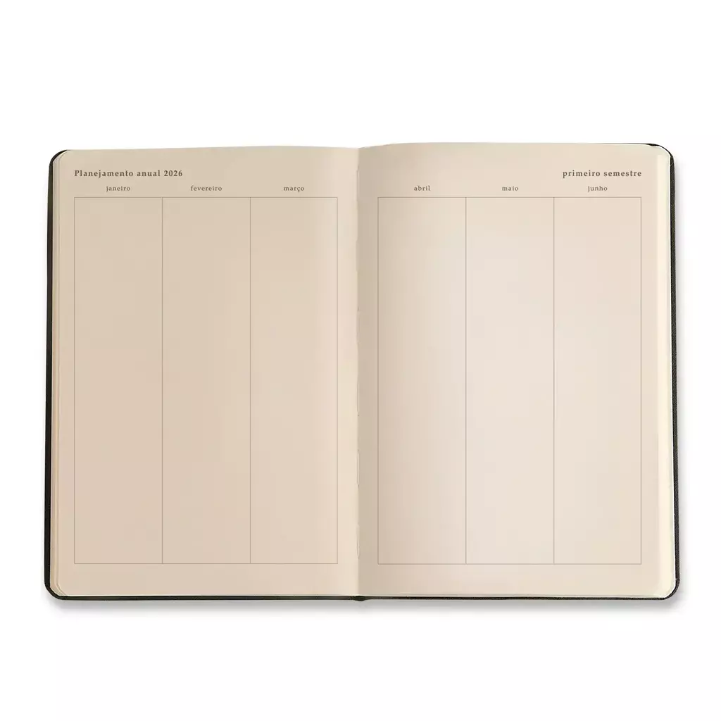 A Agenda Planner Cicero 2026 Semanal 14 x 21cm é para quem quer ter o controle da sua semana em duas páginas. Capa com "2026" e logo em hot stamping.