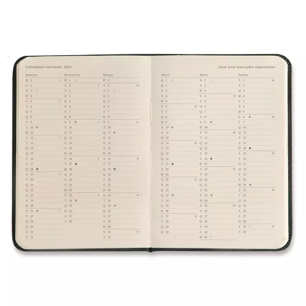 No início de cada mês, temos uma dupla com a visão de todos os seus dias, agora acompanhados dos calendários dos meses anterior e posterior. Uma visualização da organização a médio prazo.