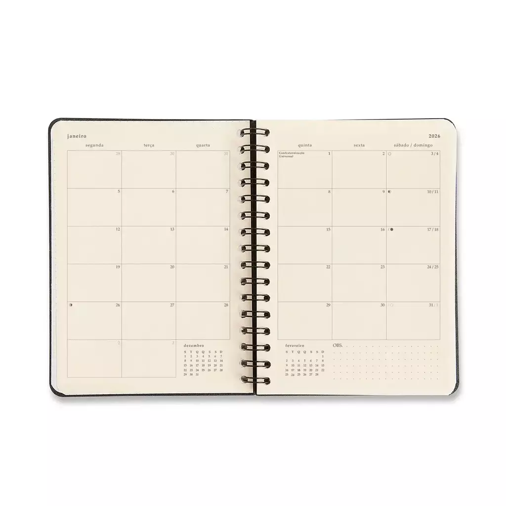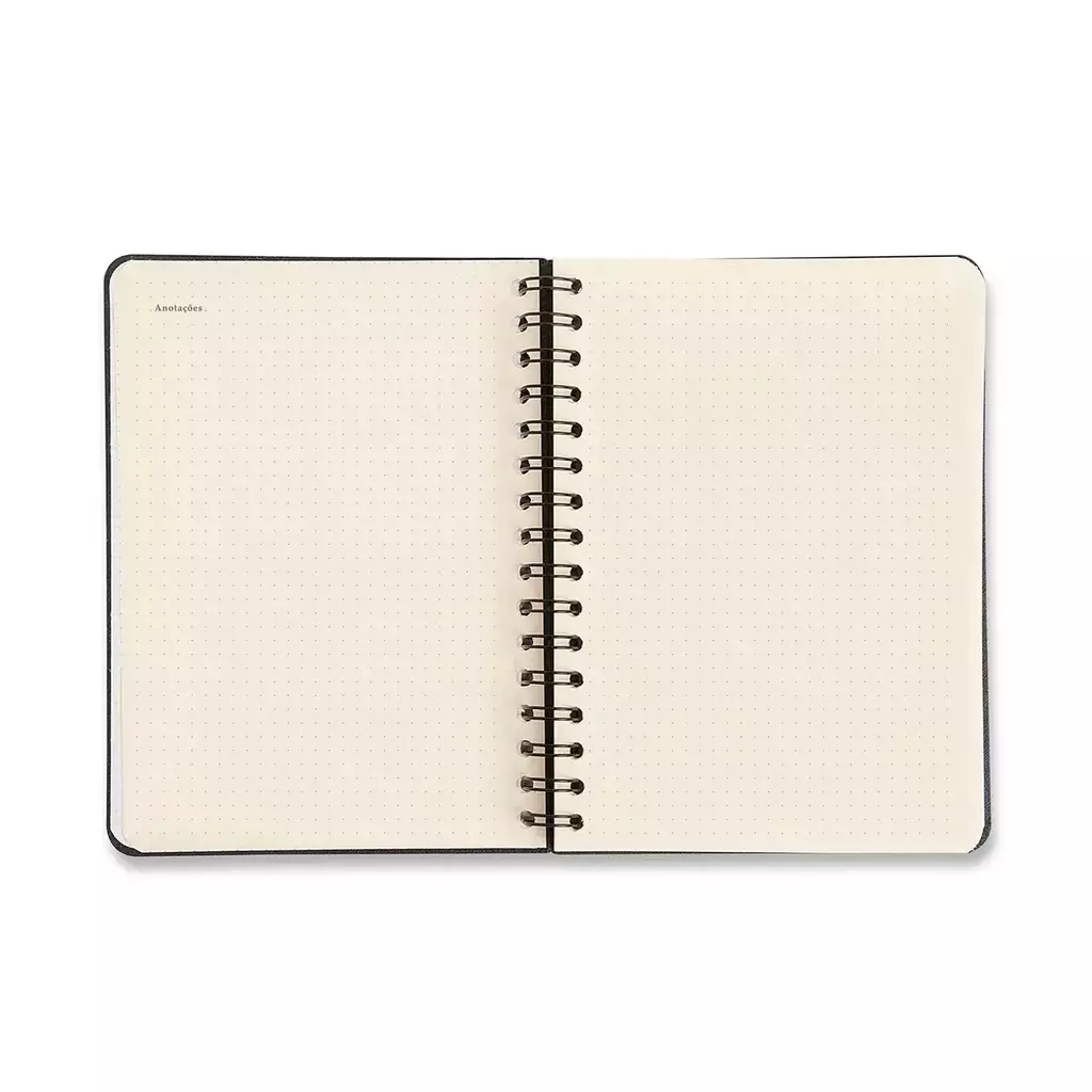 A Agenda Planner Wire-o 2026 Semanal Anotações A5 tem um formato prático e funcional, perfeita para o seu dia a dia. Este miolo é para quem consegue se organizar em uma página, e conta com uma outra pautada para escrever um pouco mais. Capa material pelica, com "2026" e logo em baixo relevo.