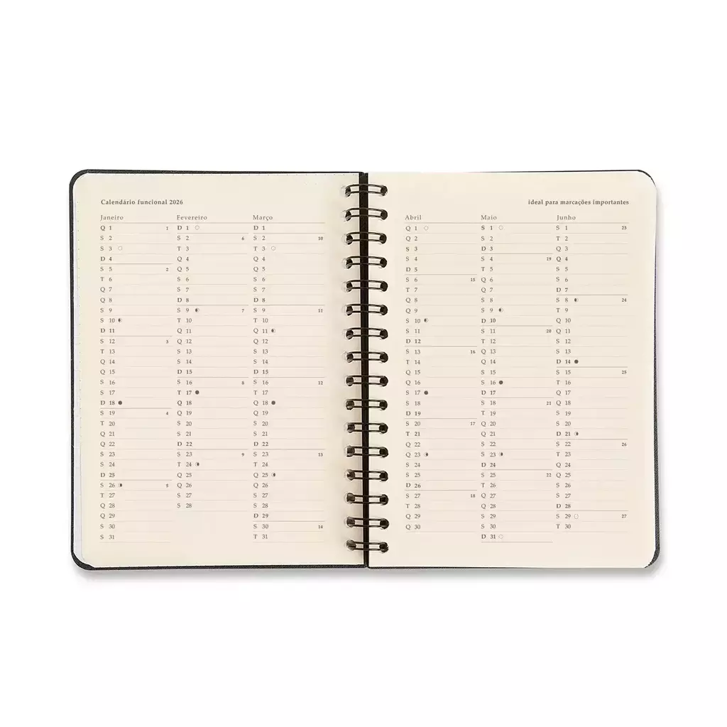 A Agenda Planner Wire-o 2026 Diária A5 é para quem gosta de ter o dia em suas mãos com controle de horas, com um dia por página. O formato wire-o traz praticidade e uma maior funcionalidade. Capa com aplicação de hot stamping dourado trazendo sofisticação e elegância.