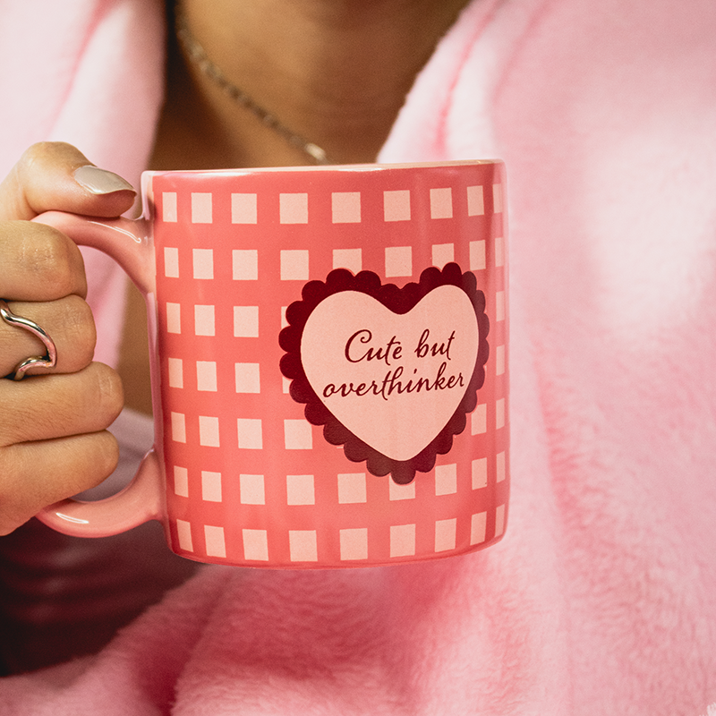 A Caneca Love Overthinker é perfeita para acompanhar aqueles momentos de reflexão (ou de overthinking, claro!). Com uma estampa xadrez em tons de rosa e a frase “Cute But Overthinker” estampada na parte externa, ela une fofura e autenticidade.